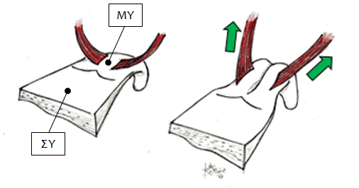 Σχ. 8, 9. Η δράση των ανελκτήρων του υπερώιου ιστίου μυών. ΣΥ: σκληρή υπερώα, ΜΥ: μαλακή υπερώα. Αριστερά: οι μύες σε χάλαση. Δεξιά: σύσπαση των μυών και έλξη της μαλακής υπερώας προς τα πάνω και πίσω (βέλη), ούτως ώστε να έρθει σε επαφή με τον φάρυγγα.